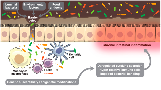 Рисунок 1. Современная гипотеза патогенеза ВЗК. Микробиота кишечника, факторы окружающей среды и пищевые антигены нарушают целостность кишечного барьера и проникают через него в более глубокие слои подслизистой ткани. В генетически восприимчивом организме происходят эпигенетические модификации и нарушение регуляции врожденного и адаптивного иммунного ответа. В конечном итоге это проявляется воспалением кишечника [Адаптировано из 7].