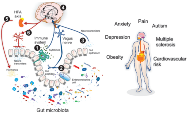 Рисунок А (слева). Ось «микробиота–кишечник–мозг». Прямые и непрямые пути (эндокринные, иммунные и нервные) двунаправленного взаимодействия между микробиотой кишечника и центральной нервной системой. Пути «от кишечника к мозгу» (синие стрелки): (1) лимфоциты получают сигналы из просвета кишечника и выделяют сигнальные молекулы (цитокины), которые оказывают действие на соседние клетки и удалённо; (2) пептидами, выделяемыми энтероэндокринными клетками кишечника, активируют чувствительные окончания блуждающего нерва; (3) микробиота кишечника выделяет нейромедиаторы, которые достигают клетки эпителия кишечника и оказывают влияние на них и удалённо. (4) Нейронные сети в головном мозге, включающие миндалевидное тело (Am) и островковую кору (IC), обрабатывают сигналы от кишечника. Последовательная активация гипоталамуса (Hy) запускает сигнал по пути «от мозга к кишечнику» (красные стрелки): (5) кортикостероиды высвобождаются в результате активации гипоталамо-гипофизарно-надпочечниковой системы (HPA) и модулируют состав микробиоты кишечника; (6) так называемый противовоспалительный холинергический рефлекс и/или симпатическая активация высвобождают нейротрансмиттеры, непосредственно влияющие на состав кишечной микробиоты. Рисунок B (справа). Состояния организма, на которые влияет ось «микробиота-кишечник-мозг». Последние научные данные свидетельствуют о том, что кишечная микробиота через ось «микробиота-кишечник-мозг» может играть роль при некоторых состояниях организма, таких как висцеральная боль, расстройства аутического спектра, ожирение, сердечно-сосудистый риск, тревога/депрессия, рассеянный склероз [Адптировано из 4]
