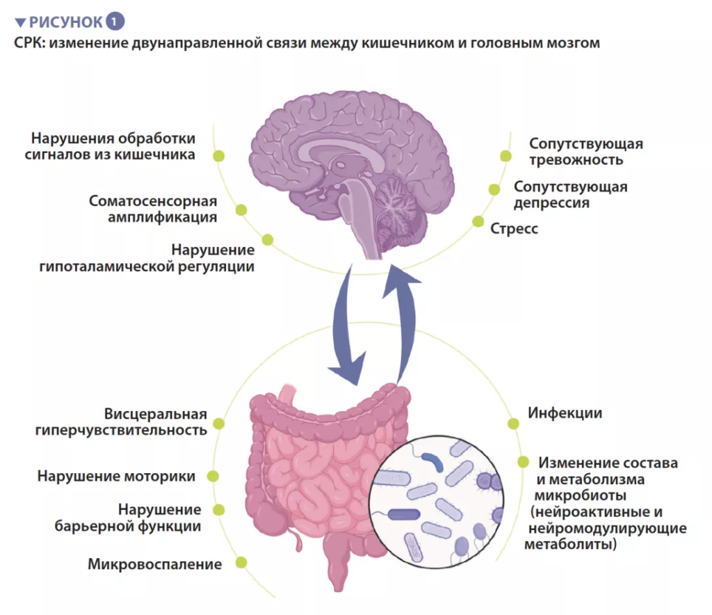 В настоящее время СРК рассматривают как нарушение двунаправленного взаимодействия кишечника и головного мозга. При рутинных лабораторных и инструментальных исследованиях не удаётся обнаружить органическую причину заболевания. А вот эмоциональные факторы, факторы питания, приём некоторых лекарств способны уменьшать или усиливать симптомы. В развитии заболевания играет роль сочетание патофизиологических и психосоциальных факторов (см. РИСУНОК 1 [Адаптировано из 3]).